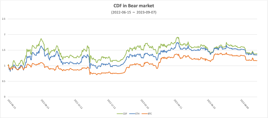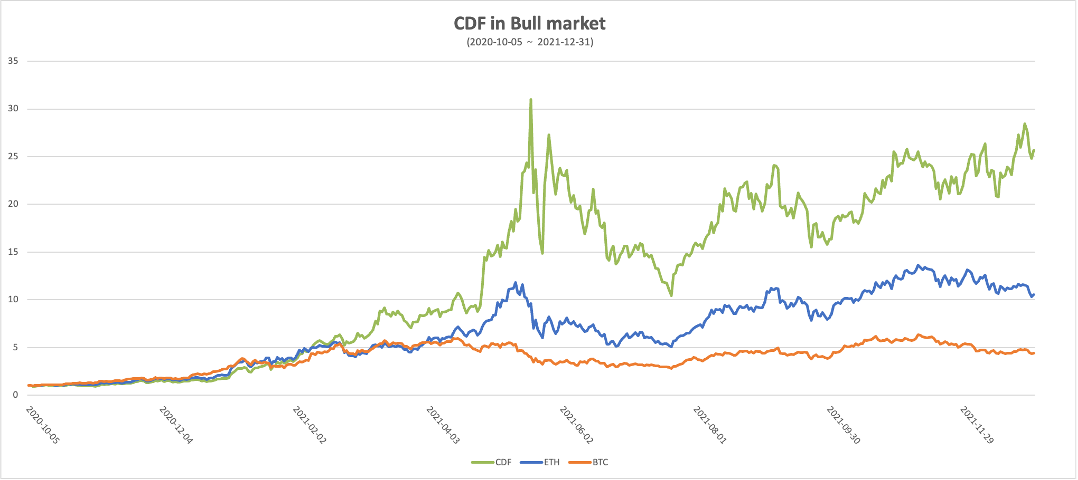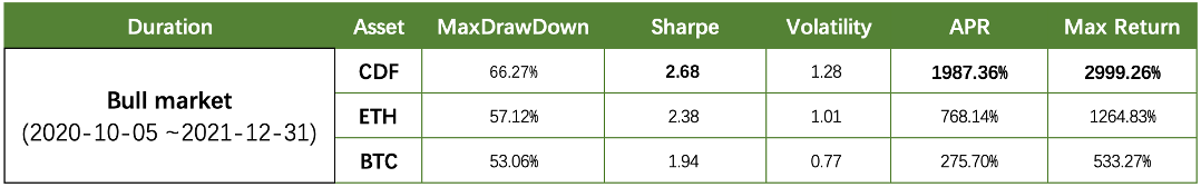 In the chart , it is evident that CDF, ETH, and BTC all experienced significant net asset value growth from October 5, 2020, to December 31, 2021, spanning an entire bull market cycle. However, what sets CDF apart is its outstanding performance during this upward market trend.