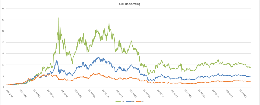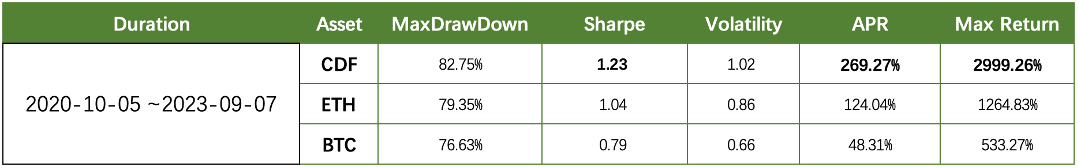 During this three-year backtesting period, CDF achieved an Annual Percentage Rate (APR) of 269.27%, far surpassing ETH and BTC, which yielded 124.04% and 48.31%, respectively. This signifies that CDF delivers higher returns, allowing investors to generate more substantial gains within the same timeframe.